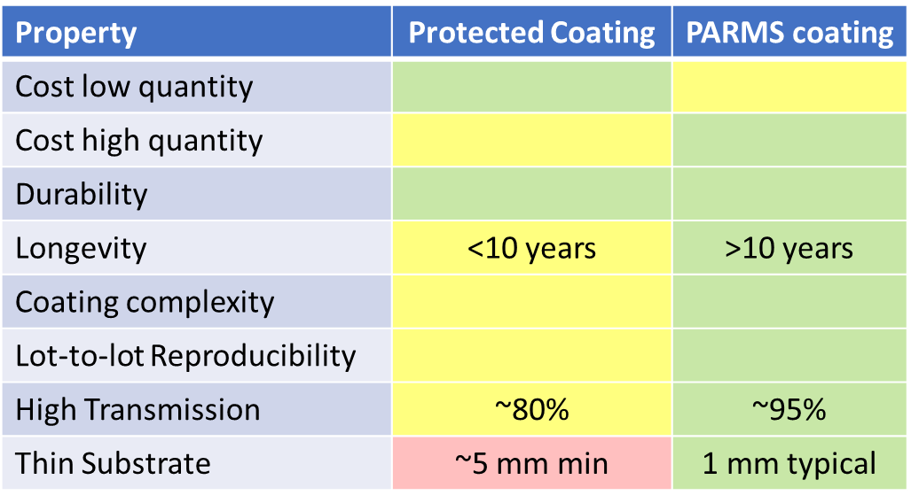 There are many advantages to PARMS manufactured filters. The coatings are extremely hard, allowing the coatings to be exposed to the environment. This durability, combined with the absence of an epoxy layer, results in an expected lifetime in excess of 10 years.