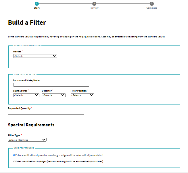 - Select the filter type, and your preferred method of entering specifications, by center wavelength or by edges