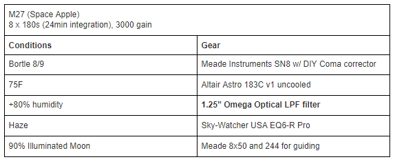 This next contribution comes from Russell Hippert. He says that “with far less integration time than my best image from home so far, this is the first time I’ve ever picked up hints of the “X” and outer structure. All thanks to the Omega LFP filter”. He also included the conditions when the photo was taken and the gear used;