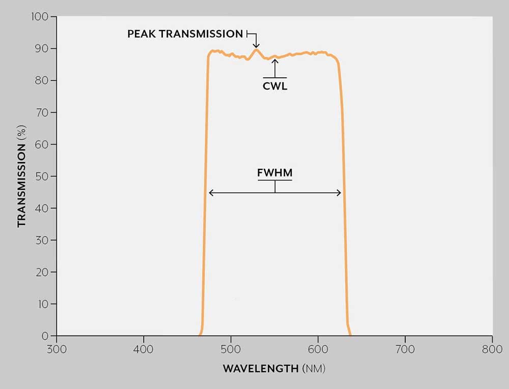 Peak Transmission is the maximum transmission of the filter (%). Center Wavelength (CWL) is the midpoint of the transmitting region (nm). Full-width half-max (FWHM) describes the width of the transmitting region at half of the maximum transmission value (nm). Because of the physics of thin-film interference filters, FWHM generally increases with wavelength. It can be calculated using a percentage of the center wavelength.