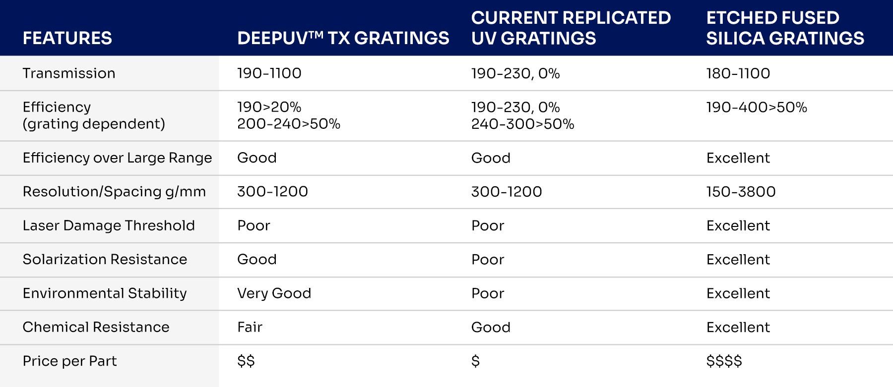 The resolution of the DeepUV™ products is on par with the original Optometrics transmission UV TX gratings which typically cut off below 240nm.