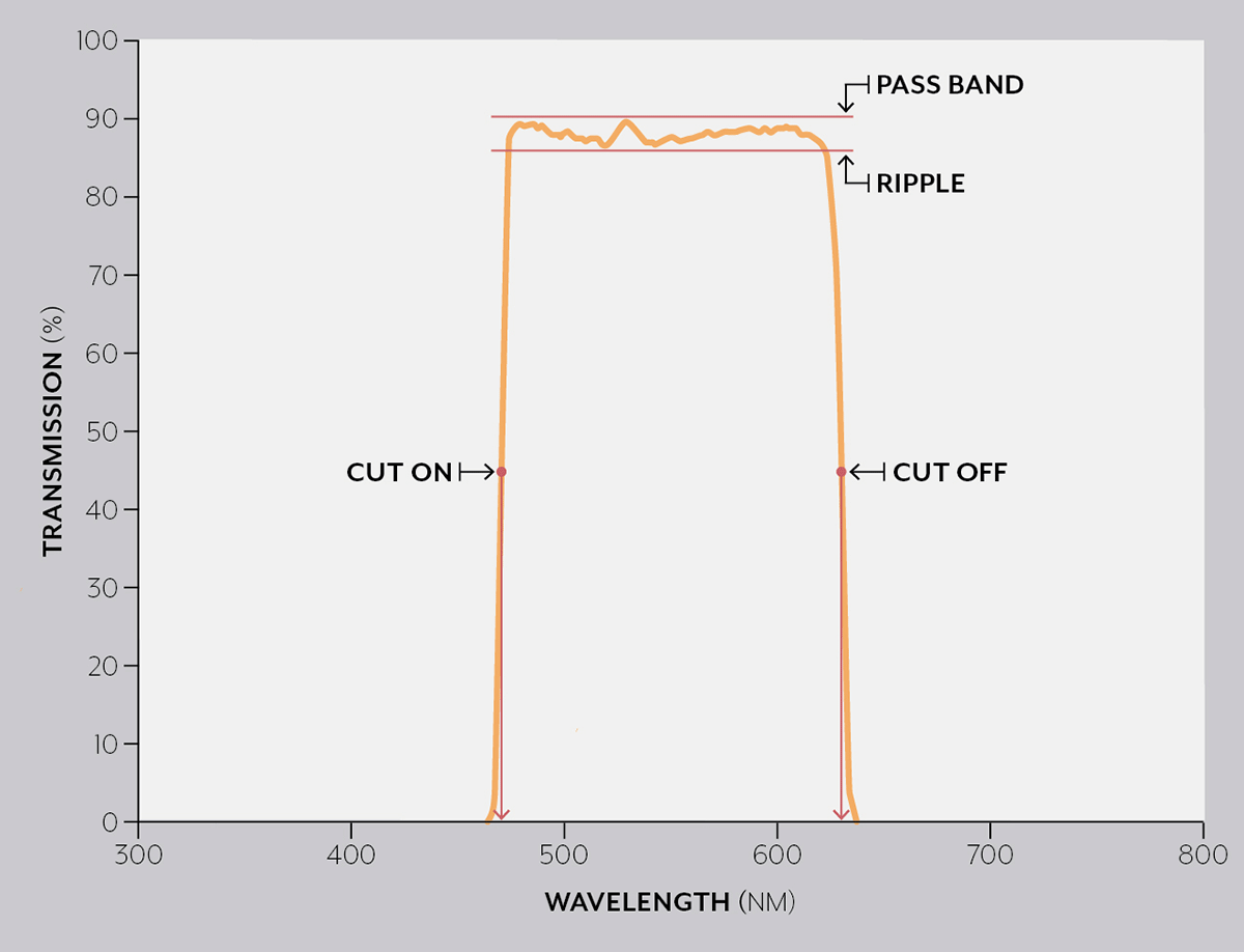 Bandpass filters (also called band pass filters, BP filters or band-pass filters) have been a mainstay of Omega's business since the early days when we produced some of the first bandpass filters for supermarket scanners back in the mid-1970s. They are designed to have high transmission over a certain wavelength range while blocking light from other wavelengths to provide good signal-to-noise in the transmitting region.